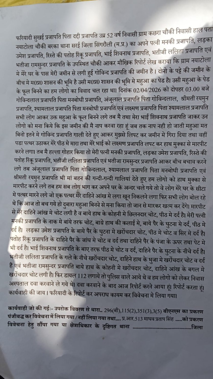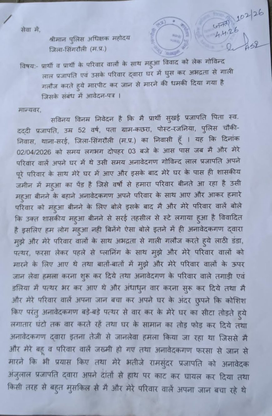 UNITED NEWS OF ASIA. प्रदीप पाटकर, सिंगरौली। मध्यप्रदेश के सिंगरौली जिले से एक गंभीर और चिंताजनक मामला सामने आया है, जहां महुआ को लेकर हुआ एक मामूली विवाद देखते ही देखते हिंसक झड़प में बदल गया। इस घटना में एक ही परिवार के कई लोगों के साथ बेरहमी से मारपीट की गई, जिसमें बुजुर्ग, महिलाएं और मासूम बच्चे भी शामिल हैं। घटना के बाद से पीड़ित परिवार दहशत में है और न्याय के लिए दर-दर भटकने को मजबूर है।