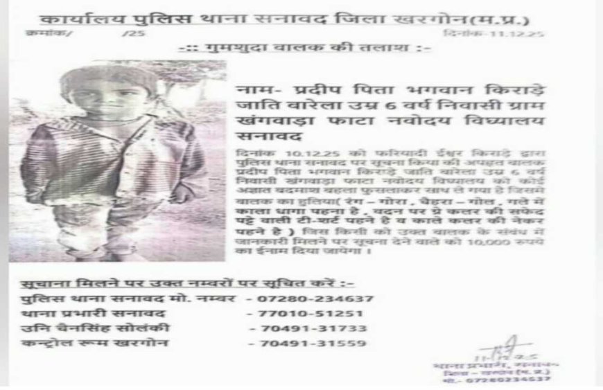 UNITED NEWS OF ASIA. खरगोन जिले के सनावद थाना क्षेत्र अंतर्गत खंगवाड़ा गांव में 6 साल के मासूम बच्चे के अपहरण की घटना से पूरे इलाके में हड़कंप मच गया है। अपहृत बच्चे की पहचान प्रदीप किराड़े के रूप में हुई है। घटना के बाद से गांव में दहशत का माहौल है और परिजन गहरे सदमे में हैं।