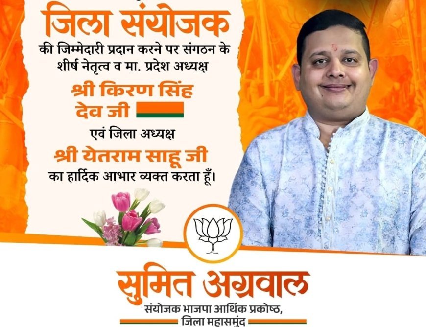 अपनी नई जिम्मेदारी मिलने पर सुमित अग्रवाल ने संगठन के प्रति आभार व्यक्त करते हुए कहा कि पार्टी ने उन पर जो विश्वास जताया है, वह उनके लिए गौरव और बड़ी जिम्मेदारी दोनों है। उन्होंने कहा कि वे इस दायित्व का निर्वहन पूरी निष्ठा, ईमानदारी और सक्रियता के साथ करेंगे तथा पार्टी की नीतियों और कार्यक्रमों को आमजन तक प्रभावी ढंग से पहुंचाने का प्रयास करेंगे।