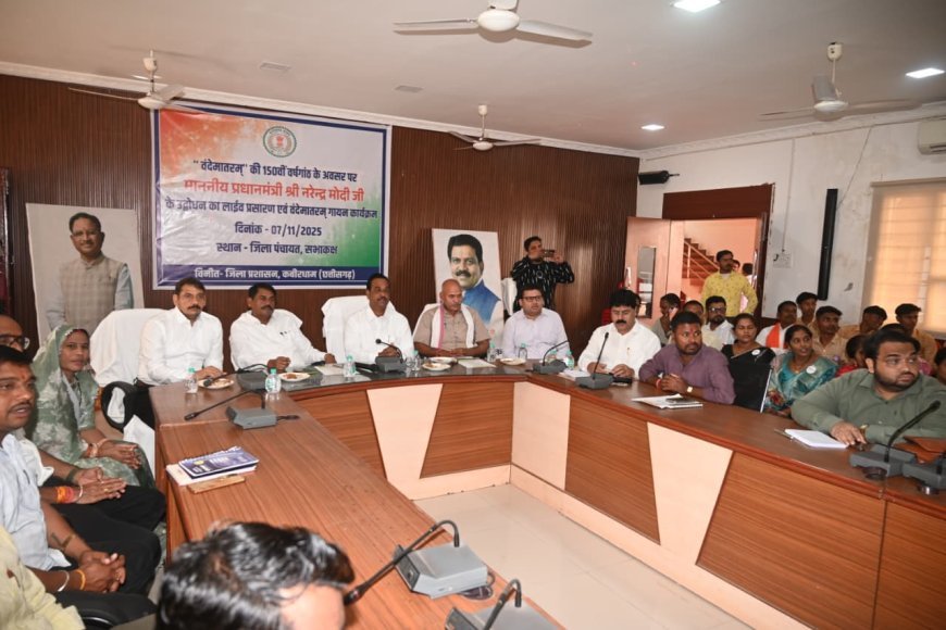 ‘वंदे मातरम्’ के 150वें स्मरणोत्सव पर प्रधानमंत्री नरेंद्र मोदी ने राष्ट्रगीत को मां भारती की साधना और आराधना की प्रेरक अभिव्यक्ति बताया। कवर्धा सहित देशभर में आयोजित कार्यक्रमों में शासकीय कार्यालयों, विद्यालयों और पंचायतों में सामूहिक रूप से ‘वंदे मातरम्’ का गायन किया गया। प्रधानमंत्री के उद्बोधन का सीधा प्रसारण जिला पंचायत सभाकक्ष से किया गया, जिसमें जनप्रतिनिधि, अधिकारी और छात्र-छात्राएं बड़ी संख्या में शामिल हुए।